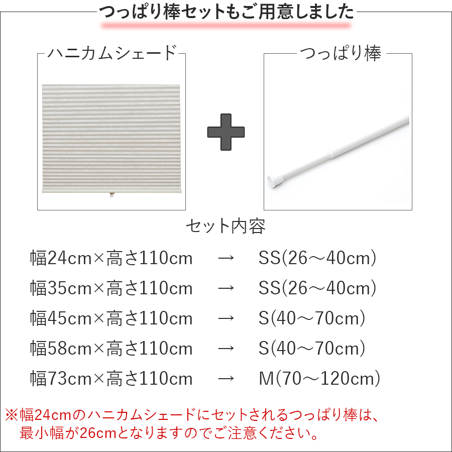突っ張り棒で簡単に取り付け可能なハニカムシェード。ハニカム構造が空気の壁を作ってくれるから、夏は暑い日差しからお部屋の空気を守り冷房効率アップ。冬は暖かい空気を逃さず、暖房効率アップ。一年中省エネ。フリーカットタイプなので、スリット窓や小窓など色々な窓のサイズにあわせてカット可能です。・この商品は返品及び交換は承れません。・突っ張り棒は直径1.4cm以内のポールをご使用ください。・幅24cmのハニカムシェードつっぱり棒セットにセットされるつっぱり棒は、最小幅が26cmとなりますのでご注意ください。・つっぱり棒セットのつっぱり棒のカラーはホワイトのみとなります。・北海道、沖縄県及び離島地域は別途送料がかかります。・ご決済時に送料が加算される地域におきましては、加算される送料が必要となりますのでご決済時の画面をご確認ください